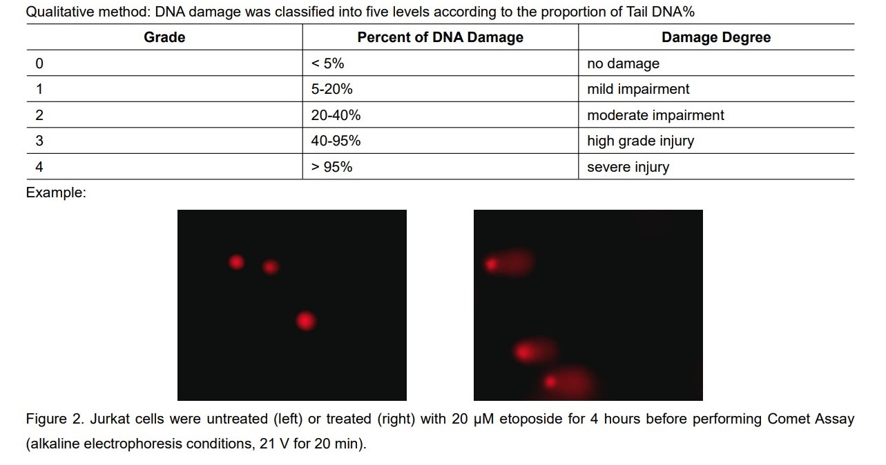 數據分析 DNA 損傷是通過測量細胞核遺傳物質(“彗星頭(comet head)”)和由此產生的“尾巴”之間的位移來量化的。 Tail Moment 和 Tail DNA% 是分析 Comet 檢測結果的兩個最常用參數。每個樣品至少應分析 50-100 個細胞。考慮到遺傳物質的遷移以及尾部 DNA 的相對量,尾矩(Tail Moment )被認為是誘導 DNA 損傷的適當指標。