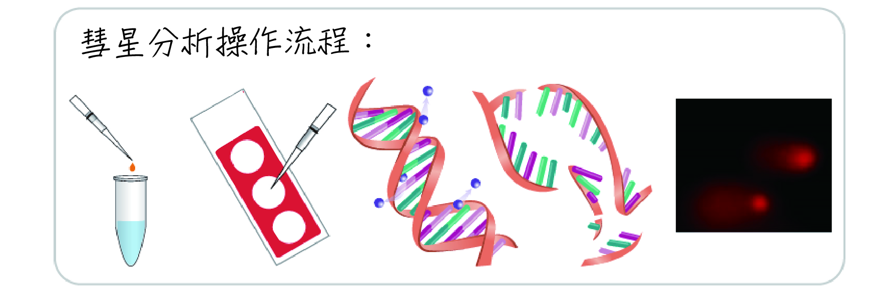 彗星分析之應用 彗星分析又稱單細胞凝膠電泳分析,為檢測細胞內DNA損傷提供簡便有效的方法。自成功地用於檢測DNA單鏈斷裂以來,經不斷地改進,已成為一種快 速、靈敏和簡便地檢測DNA損傷地方法,廣泛地應用於DNA放射損傷、DNA剪切損傷、DNA交聯的檢測、藥物的遺傳毒性評價和細胞凋亡鑒定等工作中。普通的彗星分析及螢光染色產生的資料結果需要螢光顯微鏡進行觀察,並且不易保存,如果能獲得永久的彗星分析圖像結果,並可在普通顯微鏡下檢測則可以提高彗星分析的便捷性。