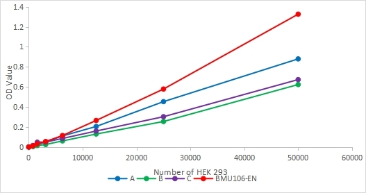 圖1 SuperKine™ Maximum Sensitivity Cell Counting Kit-8 (CCK-8) (Cat # : BMU106-EN) 與國際三大品牌A、B、C檢測不同活細胞數HEK293細胞的比較.結果表明,SuperKine™ Maximum Sensitivity Cell Counting Kit-8 (CCK-8) 具有最佳的靈敏度。