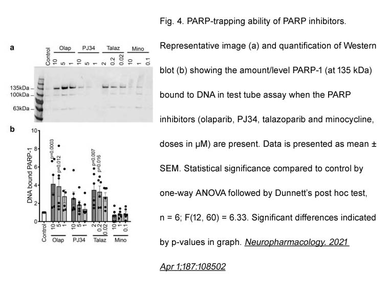 2. Asha Sinha, Sachin Katyal, et al. “PARP-DNA trapping ability of PARP inhibitors jeopardizes astrocyte viability: Implications for CNS disease therapeutics.” Neuropharmacology. 2021 Apr 1;187:108502. PMID:33631119