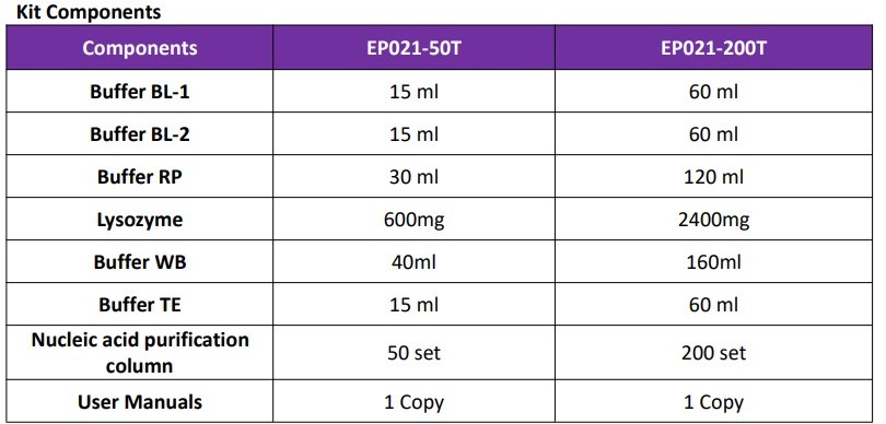 本產品適用於從1-5ml細菌培養物(bacterial culture)中分離純化 total DNA。菌體經溶菌酶(lysozyme)破碎後,經Buffer BL-1溶解,再經Buffer BL-2沉澱,去除蛋白質和細胞碎片。離心上清液中的基因組 DNA 可以結合到純化柱(purification column)上。用Buffer RP和Buffer WB洗滌去除膜上殘留的蛋白質和PCR抑制劑後,基因組DNA用Buffer TE洗脫,可立即用於各種分子生物學實驗。不需要蛋白酶 K (proteinase K)和 RNA 酶消化(RNA enzymatic digestion steps)步驟。質量好:DNA可直接用於PCR、酶切(enzyme digestion)、雜交(hybridization.)等分子生物學實驗。