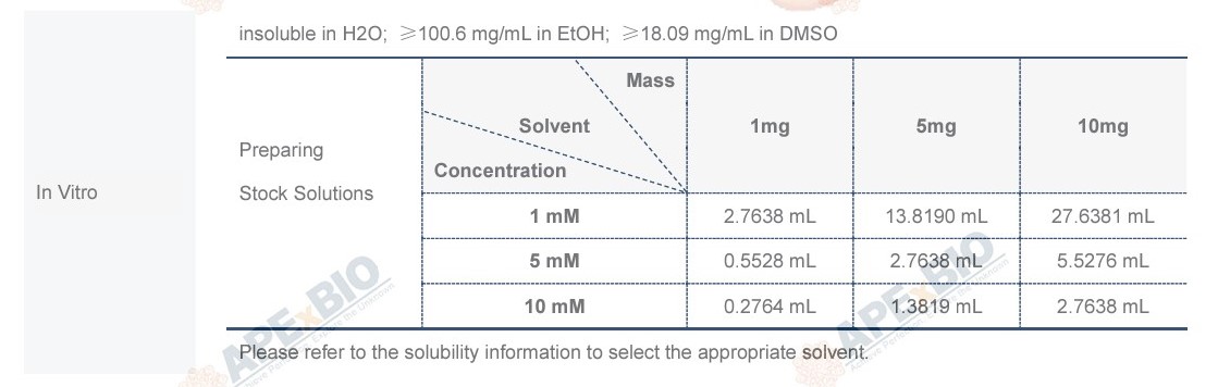 | General tips | For obtaining a higher solubility, please warm the tube at 37°C and shake it in the ultrasonic bath for a while. We do not recommend long-term storage for the solution, please use it up soon. |