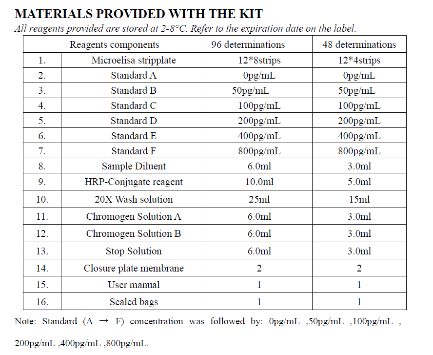 Note: 提供己配製好的標準品6瓶 Standard (A → F) concentration was followed by: 0pg/mL ,50pg/mL ,100pg/mL , 200pg/mL ,400pg/mL ,800pg/mL.
