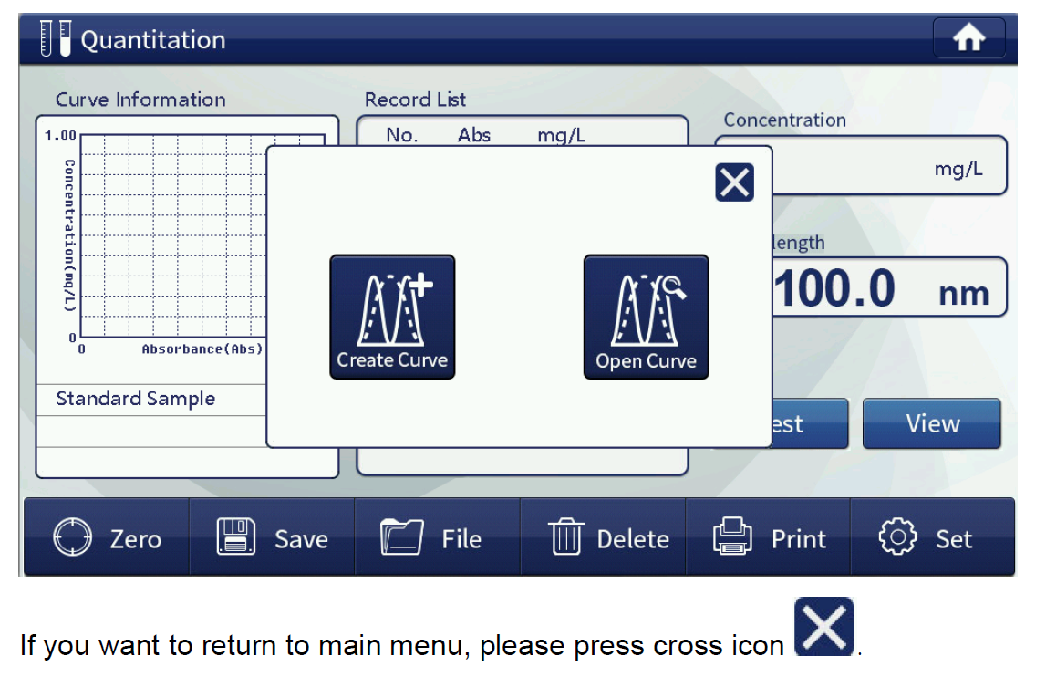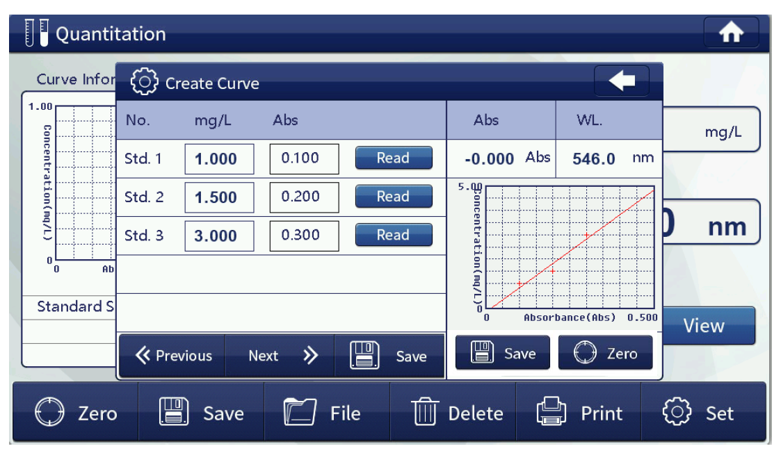 進入定量測量程序。有兩個選項:建立標準曲線或開啟已儲存的標準曲線。
