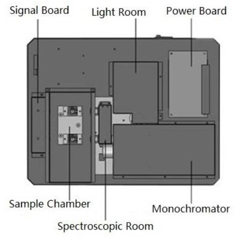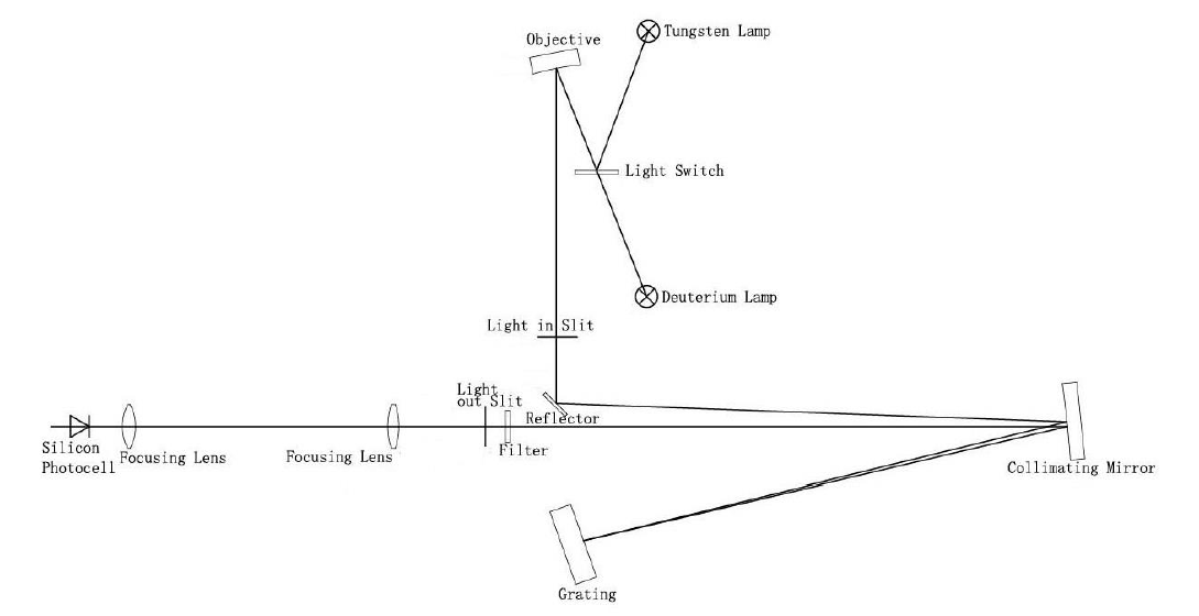 High-efficiency holographic grating of 1200 lines/mm with C-T monochromator。包含分光元件-光柵( grating)、進狹縫(into the slit)、狹縫(slit)、反射鏡(mirror)、聚焦透鏡(focusing lens)、以及波長濾光片驅動系統,將發出的單色光(monochromatic light )從光學分離器中分解為單色任意波長的單色光方法。光柵(Raster):色散原件,模型採用1200/mm全像光柵(holographic grating)保證高解析度和低雜散光。