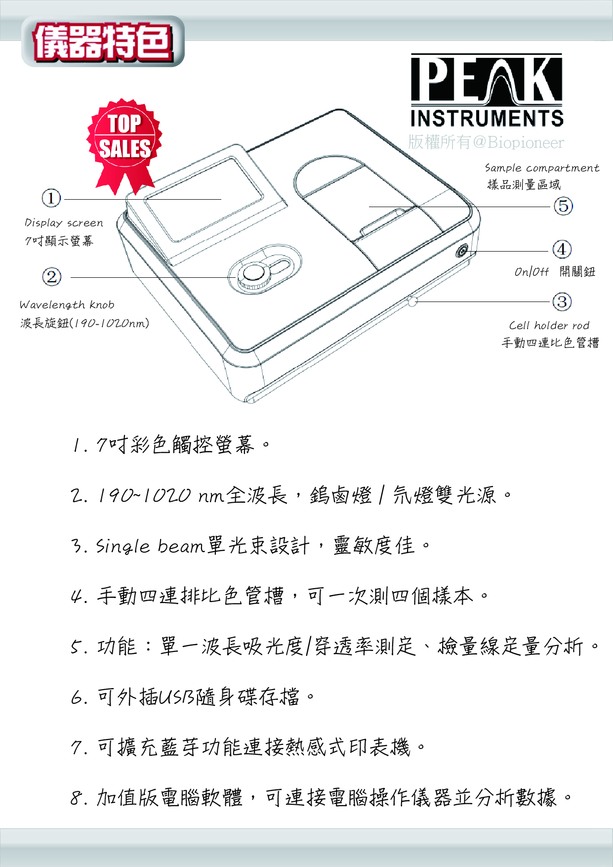 Peak E-2000UV ║ UV/VIS全波長單光束觸控式分光光度計
