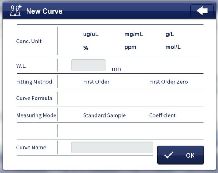 您可以輸入波長(wavelength)、選擇濃度單位(concentration units)和擬合模式(線性、線性過零點)、測試模式(標準樣品或係數)。當您使用係數模式時,它將在因子欄中顯示相關因子。如果選擇標準樣品模式,則需要輸入標準樣品的數量(至少兩個)。