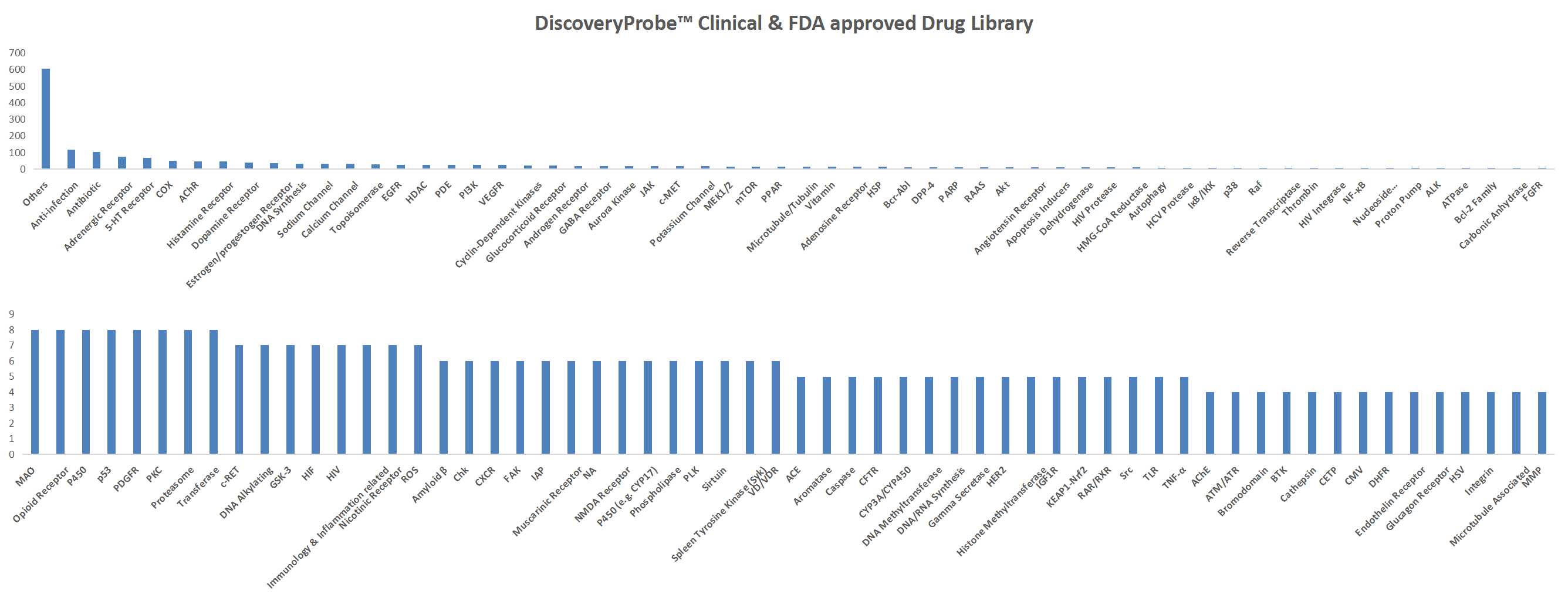 DiscoveryProbe™ FDA 批准的藥物庫(drug library)包括 2320 種 FDA 批准的用於高通量篩選 (high throughput screening ,HTS) 和高內涵篩選 (high content screening ,HCS) 的藥物。它可以用來為舊藥尋找新靶點。這些藥物的生物活性和安全性已通過臨床試驗得到證實。由於都是FDA批准的藥物,篩選出來的藥物可以直接用於臨床試驗。