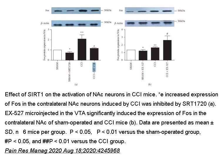 - 3. Yangyang Li, Lei Wang, et al. “SIRT1 Mediates Neuropathic Pain Induced by Sciatic Nerve Chronic Constrictive Injury in the VTA-NAc Pathway.” Pain Res Manag 2020 Aug 18;2020:4245968. PMID: 32922581