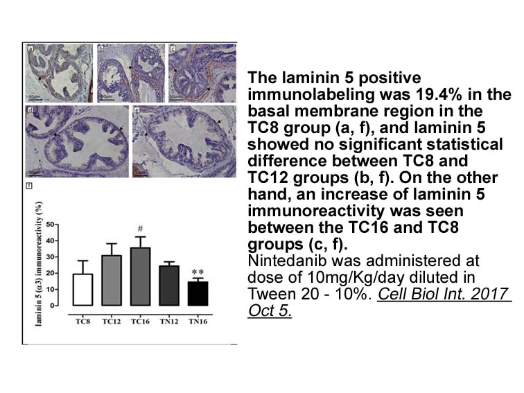 - 3. Pangrazi EN, da Silva RF, et al. “Nintedanib treatment delays prostate dorsolateral lobe cancer progression in the TRAMP model: Contribution to the epithelial-stromal interaction balance.” Cell Biol Int. 2017 Oct 5. PMID:28980742