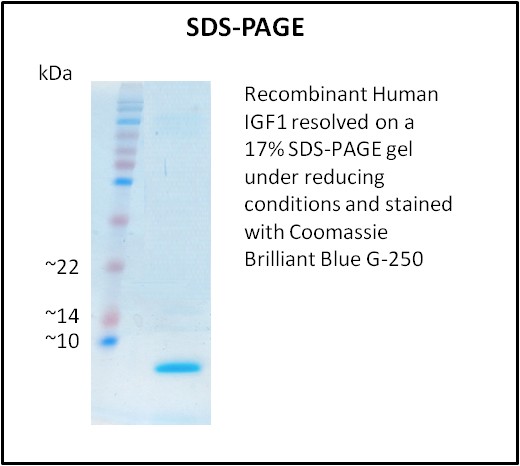 Description The Insulin Growth Factors belong to the Insulin gene family, the prototypic members of which include insulin and relaxin. Also known as somatomedin C, IGF1 is known to stimulate the proliferation of a wide range of cells including muscle, bone, and those of the cartilage tissue. A dominant effector of the growth hormone, mature IGF1 is generated by proteolytic removal of the N- and C- terminal pro-peptide regions. Mature human IGF1 shares 94% and 96% amino acid sequence identity with mouse and rat IGF1, respectively, while exhibiting cross-species activity. Circulating IGF1 is produced by hepatocytes while local IGF1 is produced by various other tissues in which it exerts paracrine effects. Recombinant Human IGF1 is a globular, 7.7 kDa protein that contains 3 native intra-molecular disulfide bonds.