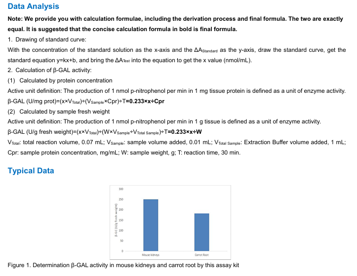 | Features & Benefits | • Provides a simple, sensitive, rapid β-galactosidase (β-GAL) detection method in Animal Tissues, Plant Tissues.. • Detailed sample preparation and result calculation methods are provided. |
