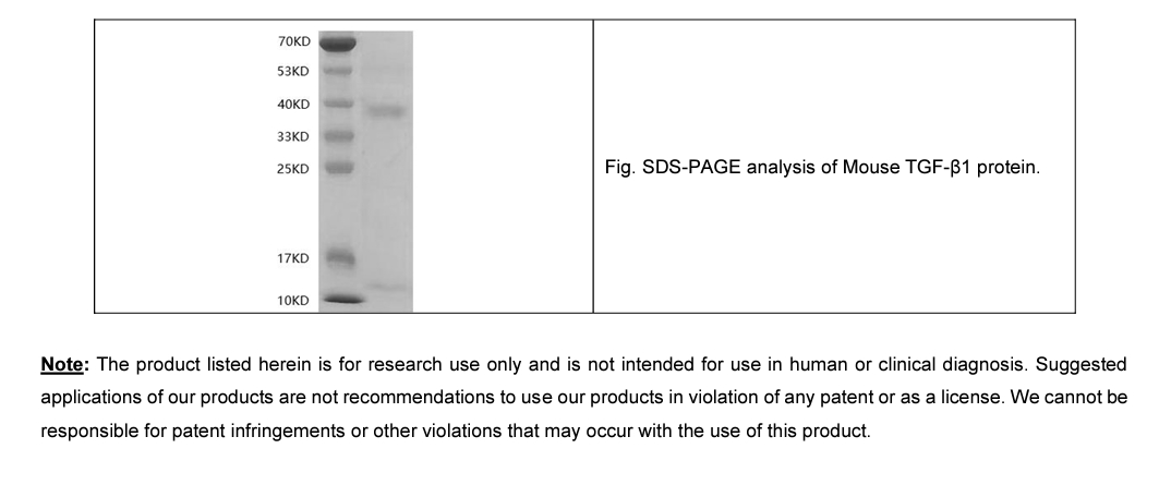 | Protein length | The recombinant human Mouse TGF-β1 protein consists of 91 amino acids and predicts a molecular mass of 42.7 KD. It migrates as an approximately 54, 41 and 15 KD band in SDS-PAGE under reducing conditions. |