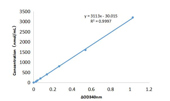 Fig. Standard Curve of acetyl coenzyme A assay. The x-axis is OD340 and the y-axis is acetyl coenzyme A concentration (nmol/mL).