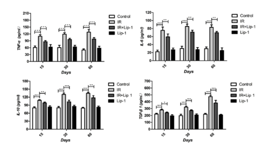 The ROS and inflammatory cytokines levels increase in acute RILI. The serum levels of inflammatory cytokines increase in RILI. Elisa was used to measure the levels of inflammatory cytokines (TNF-a, IL-6, IL-10 and TGF-b1) at day 15, day 30 and day 60.