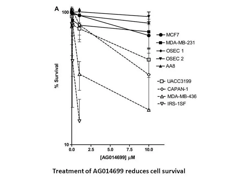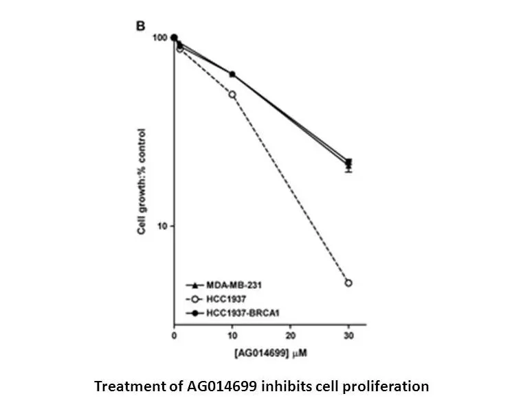 Rucaparib,也稱為 AG-014699 或 PF-01367338,是一種聚(ADP 核糖)聚合酶(PARP)抑制劑。 PARP 是一種 DNA 損傷激活核酶( DNA damage-activated nuclear enzyme),在鹼基切除修復途徑中具有關鍵的信號傳導作用。因此,rucaparib 也被發現對 DNA 修復缺陷的細胞最有效,這些細胞缺陷是由於暴露於基因毒性劑而引起的,例如輻射會產生 DNA 損傷,當 DNA 修復受損時,其毒性會增強。 rucaparib 存在下放射敏感性的增加與 γ-H2AX 和 p53BP1 焦點確定的持續性 DNA 斷裂有關。 Rucaparib 使前列腺癌細胞放射增敏,最有效的是那些 PTEN 缺陷並表達 ETS 基因融合蛋白(ETS gene fusion proteins)的細胞,該蛋白抑制 NHEJ DNA 修復 (NHEJ DNA repair)。