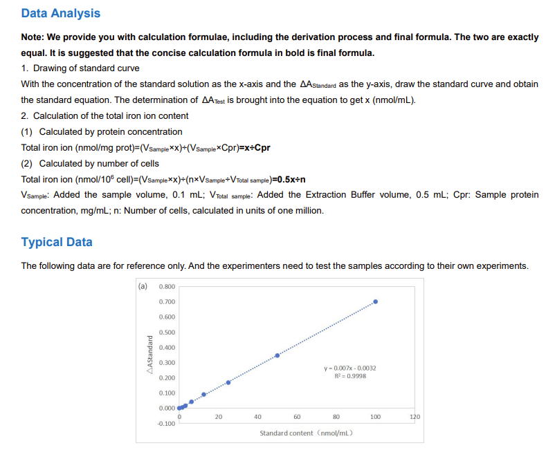 Background Iron is one of the essential trace elements of the human body, it is the main component of hemoglobin, myoglobin, cytochrome and other enzyme systems, to help oxygen transport, promote fat oxidation. Lack of iron is likely to cause anemia, metabolic disorder, and affect the body’s immune function. CheKine™ Micro Cell Total Iron Ion Content Assay Kit can be used to detect biological samples such as cells. In the kit, after cells is cracked, sodium sulfite reduces Fe3+ in the sample to produce Fe2+, Fe2+ forms a blue complex with tripyridyl triazine under acidic conditions, and has an absorption peak at 593 nm. The content of total iron ion can be calculated by measuring the absorbance of this wavelength.