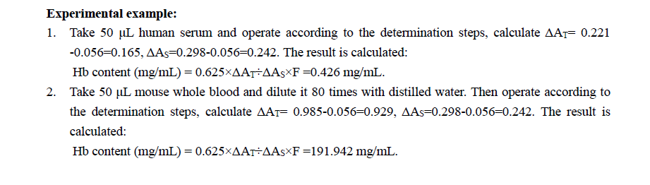 血紅蛋白 (Hemoglobin, Hb) 是一種以血紅素(heme)為輔基的含輔因子的蛋白質,在運輸和儲存氧氣方面發揮重要作用。它由兩條 α 鏈和兩條 β 鏈組成。每條鏈上都有一個含鐵原子的環狀四吡咯血紅素(cyclic tetrapyrrole heme )。氧氣(Oxygen)與鐵原子結合並在血液中運輸。改良的鹼性水溶液法(aqueous alkaline method)可用來測量血紅素 (Hemoglobin, Hb) 濃度。血紅素 (Hemoglobin, Hb) 與工作溶液反應生成有色化合物,該化合物在 400 nm 處有吸收峰。透過測量 400 nm 處吸光度的變化可以反映血紅蛋白 (Hemoglobin, Hb) 的含量。線性範圍0.01-1.25mgmL;檢出限 0.008mg/mL。