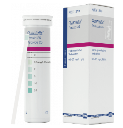 MN 品牌 的 QUANTOFIX® Peroxide 25 雙氧水試紙,這是一種半定量離子測試紙,用於測量溶液中雙氧水的含量,其測量範圍為0 至25 毫克/公升(mg/L) 的過氧化氫。 QUANTOFIX Peroxide 25 試紙可快速可靠地測定水基液體中的過氧化物( peroxides)。操作簡便,用戶使用方便:只需將其浸入樣品中,稍等片刻即可讀取結果——不到 20 秒!試紙可使用內建色標進行評估,也可與 QUANTOFIX Relax 試紙讀取器搭配使用。除了便捷的測量流程外,它還能自動產生數位化結果記錄。 QUANTOFIX Peroxide 是食品業的理想選擇。我們的試紙可用於快速、輕鬆、可靠地檢查設備的沖洗和清洗過程——可以輕鬆識別瓶子和優格罐中的消毒劑殘留。這同樣適用於醫療器材。 QUANTOFIX Peroxide-您保障食品品質和病人安全的理想夥伴。MACHEREY-NAGEL 提供三種不同測量範圍的 QUANTOFIX 過氧化物產品,以便根據您的應用選擇合適的級配。
