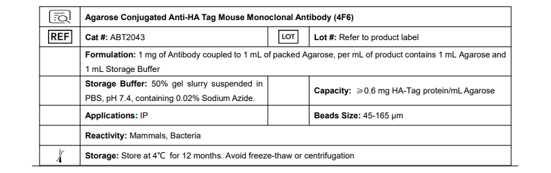 ABT2043 | Agarose Conjugated Anti-HA Tag Mouse Monoclonal Antibody (4F6) | 1 mL |