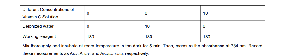 1. 將微孔板讀數儀或可見分光光度計預熱30分鐘以上,將波長調至734nm,用去離子水將可見分光光度計歸零。 2. 操作步驟(以下操作皆在96孔板或微型玻璃比色皿中進行):
