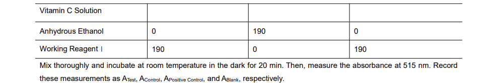 | Kit components | • Extraction Buffer •Reagent I •Vitamin C (Positive Control) |
