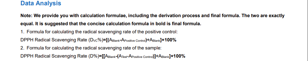 4. 不同樣本清除DPPH自由基的能力可能有顯著差異。如果要比較不同樣本的DPPH自由基清除能力,建議使用同一批次的等量樣本進行測試。